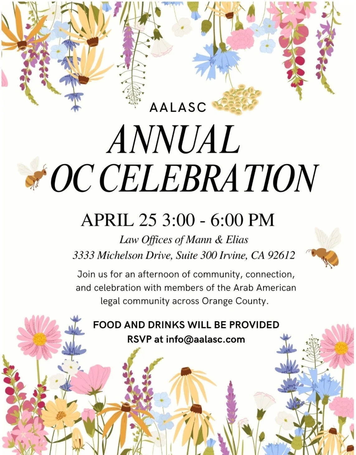 Please join us in celebrating Arab American Heritage Month at our Annual OC Celebration on Saturday, April 25, 2026, from 3-6pm at the Law Offices of Mann & Elias, located at 3333 Michelson Drive, Suite 300, Irvine CA 92612. Please see flyer below for more information.